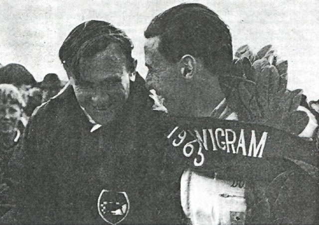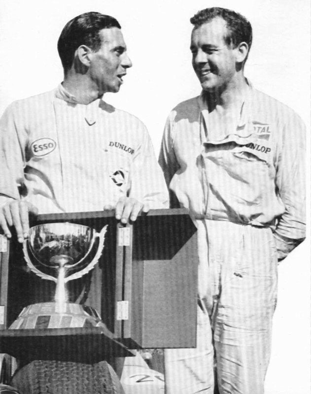 En vainqueur à Warwick Farm avec Stirling Moss à ses côtés pour le féliciter sur le podium