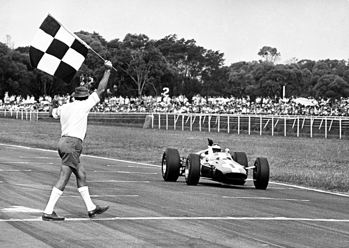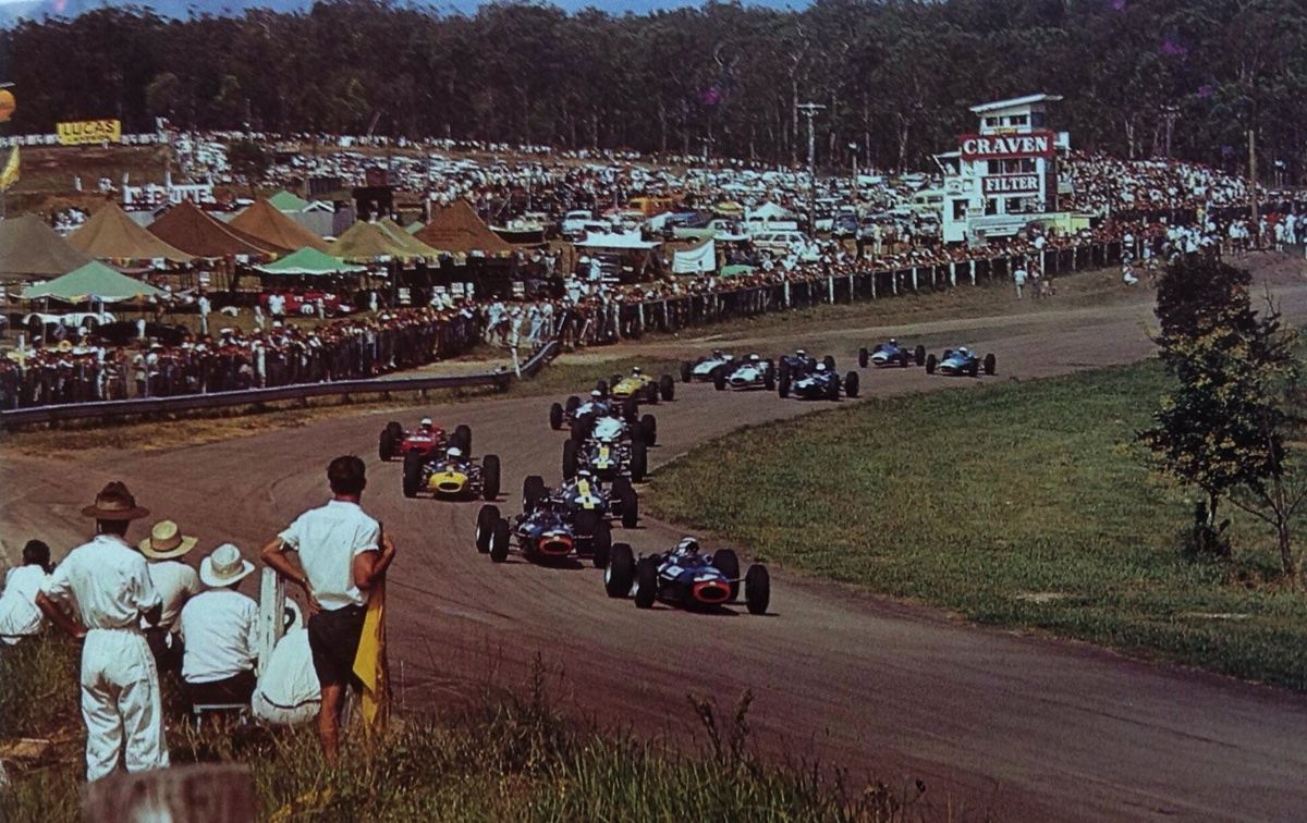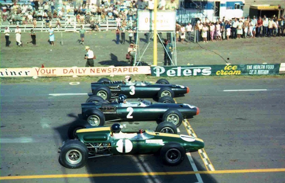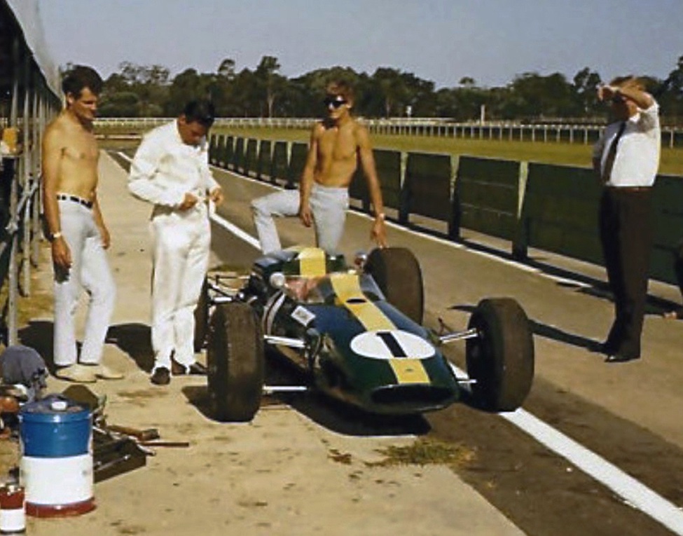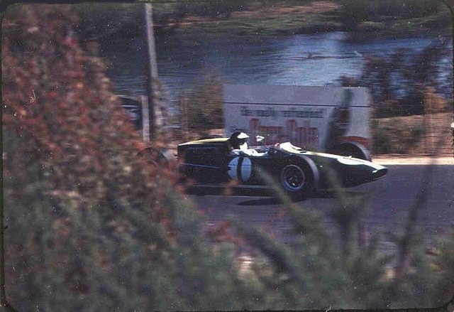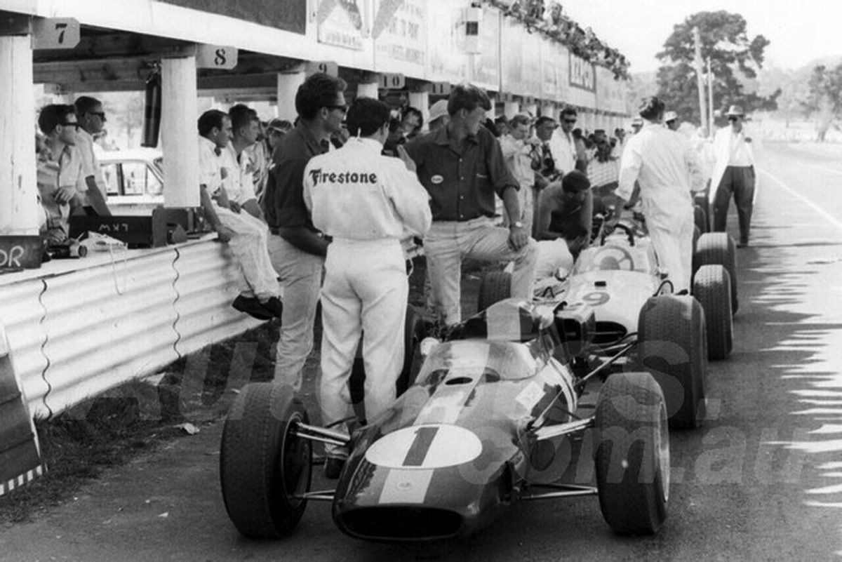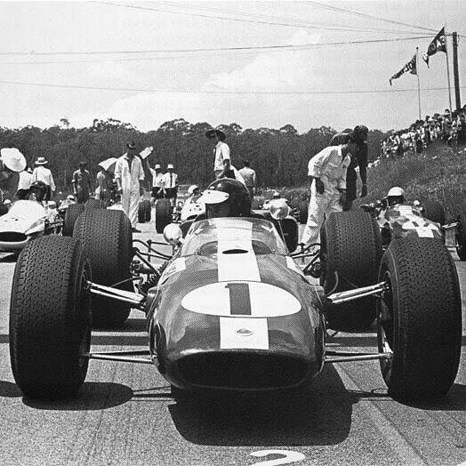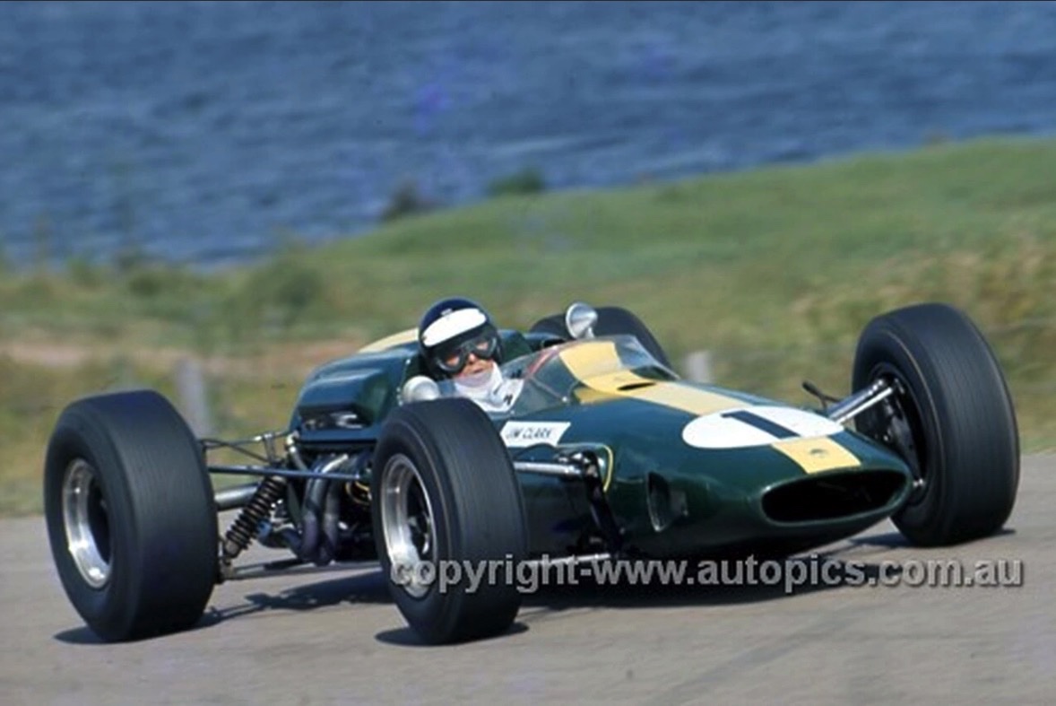 Prévue pour recevoit le moteur H16 BRM, la Lotus 33 sera finalement équipé du Climax 2,7 L pour courir en Tasmanie, ici, à Terratonga